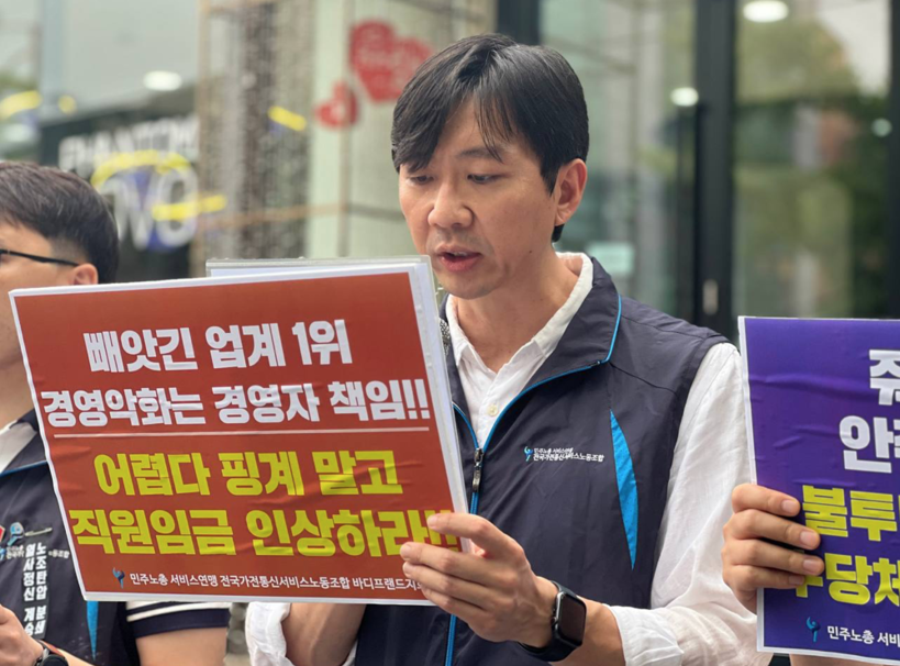 ▲ 지난 7월 21일 민주노총 서비스연맹 전국가전통신서비스노동조합 바디프랜드지회가 서울 바디프랜드 본사 앞 기자회견에서 진행했다.(사진=전국가전통신서비스노동조합 바디프랜드지회 제공) |