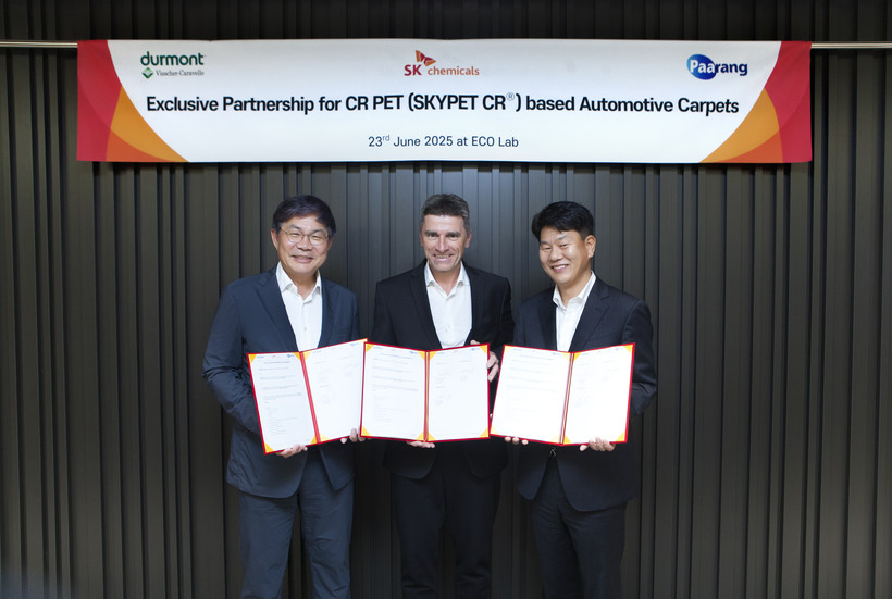 [일요주간 = 엄지영 기자] SK케미칼이 자동차 카페트 전문 제조사 듀몬트, 물류·공급망 전문기업 파아랑과 함께 재활용 PET 소재 ‘스카이펫 CR’ 공급을 위한 독점 파트너십을 체결했다고 25일 밝혔다.