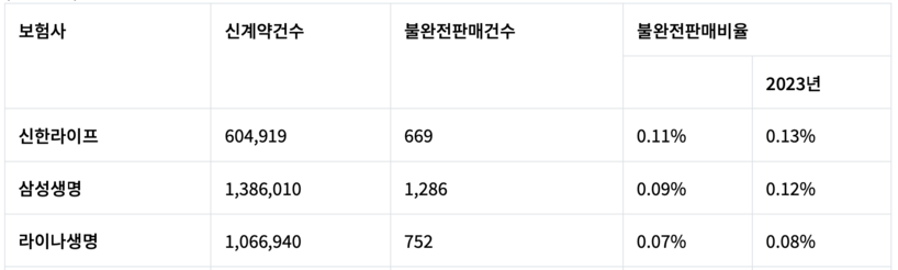 소비자주권시민회의에 따르면 올해 상반기 불완전판매비율이 가장 높았던 생명보험사는 신한라이프로 신계약건수 약 60만 건 중 669건의 불완전판매가 발생했으며 불완전판매비율은 0.11%로 이는 10개사 평균의 약 2배 수준이다.