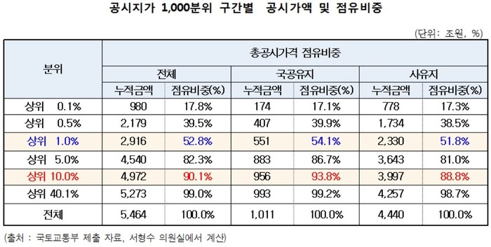 서 의원은 이번 분석 결과에 대해 “단위면적당 1000분위 공시지가 분석을 통해 토지면적별 공시가격과 총공시가액에서 차지하는 비중을 보다 정확히 알 수 있게 됐다”며