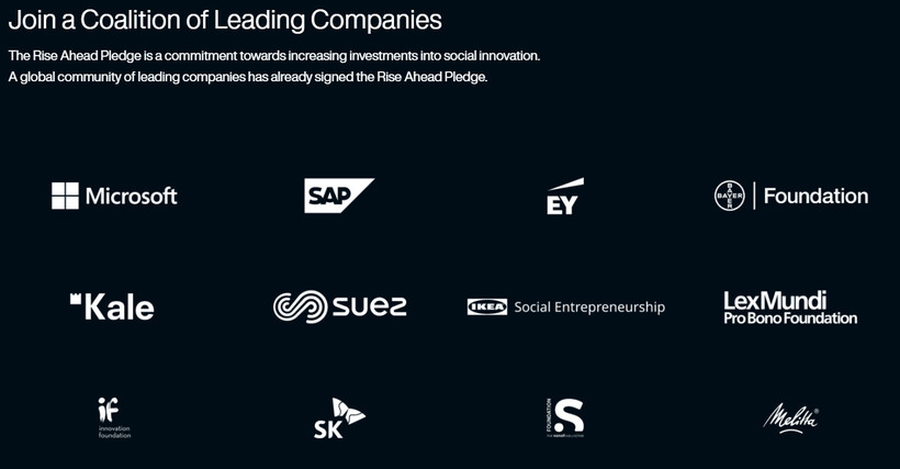 ▲ RISE Ahead Pledge 첫 번째 서명 글로벌 기업 full list (ABC 순) - ①Adecco Group’s Innovation Foundation ②Bayer Foundation ③EY ④IKEA Social Entrepreneurship ⑤Kale Group ⑥Lex Mundi Pro Bono Foundation ⑦Medtronic LABS ⑧Melitta ⑨Microsoft ⑩Sanofi’s Foundation S ⑪SAP ⑫SK CSES(사회적가치연구원) ⑬SUEZ.(자료=사회적가치연구원 제공) |