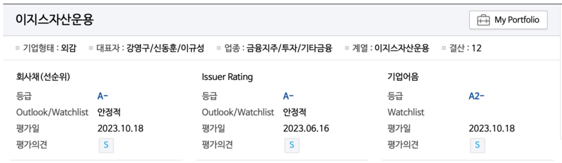 이지스자산운용은 부동산펀드 운용 위주의 집합투자업자로 업계 상위권의 지위를 보유하고 있으며 이에 기반해 이익창출능력이 우수하다는 평가를 받고 있다.