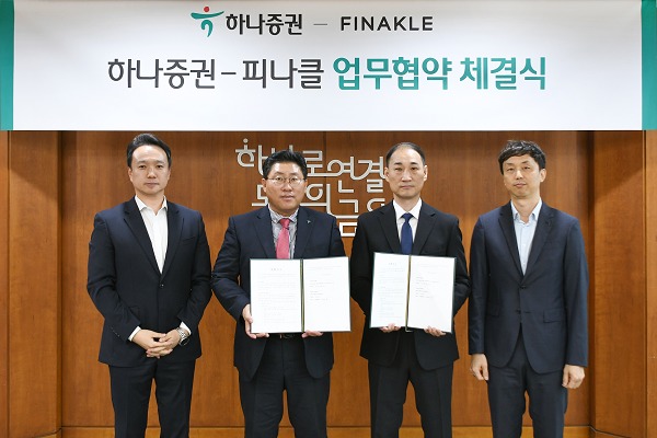 ▲ 최원영 하나증권 디지털본부장(왼쪽 두번째), 김동욱 하나증권 DX추진실장(왼쪽 첫번째), 조근효 피나클 대표(오른쪽 두번째), 전용균 피나클 이사(오른쪽 첫번째)가 협약식에서 기념촬영하고 있다. (사진 = 하나증권 제공) |