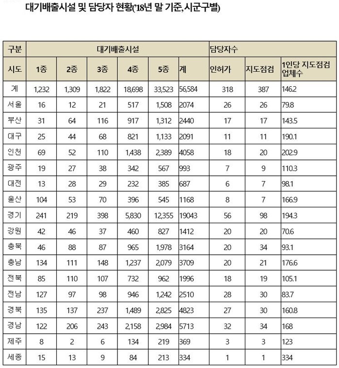 전국에서 배출시설이 가장 많은 경기도는 1만 9043개 업체를 98명이 담당해 1인당 194개 업체를 관리하는 것으로 확인됐다.