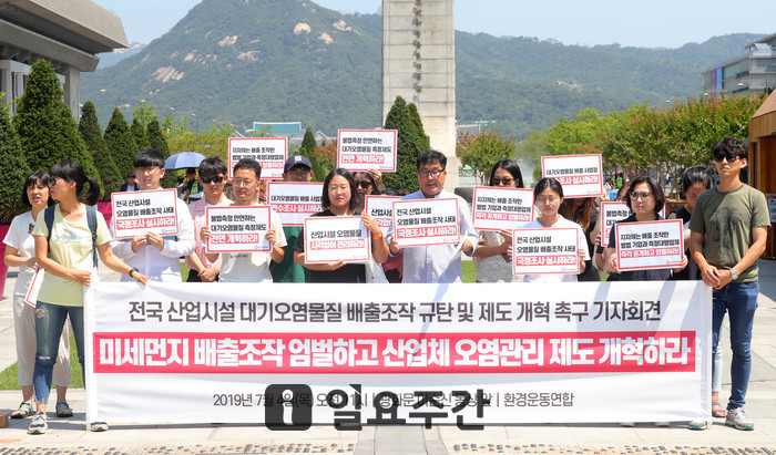 | ▲ 4일 오전 서울 종로구 세종대로 사거리에서 환경운동연합 회원들이기자회견을 열고 전국 산업시설 오염물질 배출조작 사태 국정조사 실시를 촉구하고 있는 모습. |