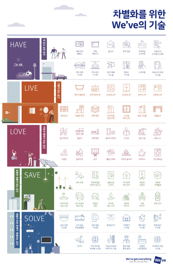 이번 기술 아이콘으로 재정립된 We’ve의 65가지의 기술(상품) 항목은 소비자들이 이해하기 쉽도록 We’ve의 5가지 핵심 키워드(Have, Live, Love, Save, Solve)에 맞추어 체계적으로 분류하고 이미지로 형상화해 고객이 쉽게 해당 상품의 적용여부를 쉽게 확인할 수 있게 했다.