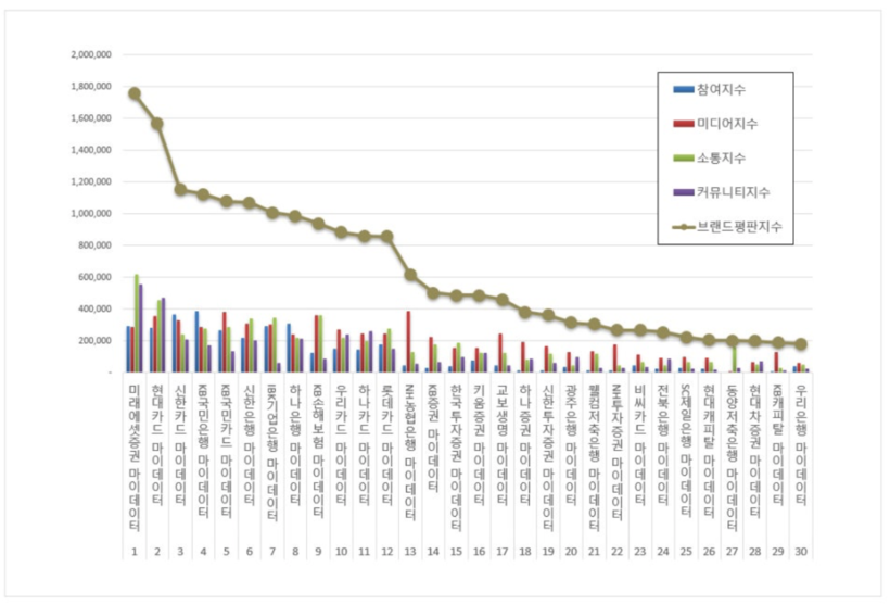 9월 금융 마이데이터 브랜드평판 30위 순위는 미래에셋증권, 현대카드, 신한카드, KB국민은행, KB국민카드, 신한은행, IBK기업은행, 하나은행, KB손해보험, 우리카드, 하나카드, 롯데카드, NH농협은행, KB증권, 한국투자증권, 키움증권, 교보생명, 하나증권, 신한투자증권, 광주은행, 웰컴저축은행, NH투자증권, 비씨카드, 전북은행, SC제일은행, 현대캐피탈, 동양저축은행, 현대차증권, KB캐피탈, 우리은행 마이데이터 순으로 나타났다.