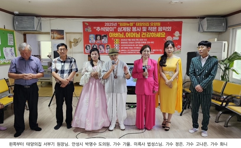 [일요주간 = 김성환 기자] (사)한국환경문화사랑 정은 이사장은 지난 18일 추석을 앞두고 경기도 안성에 위치한 태양의 집 요양원을 방문, 어르신들을 위한 삼계탕 나눔 봉사 및 작은 음악회를 개최하며 따뜻한 정을 나누는 시간을 가졌다.
