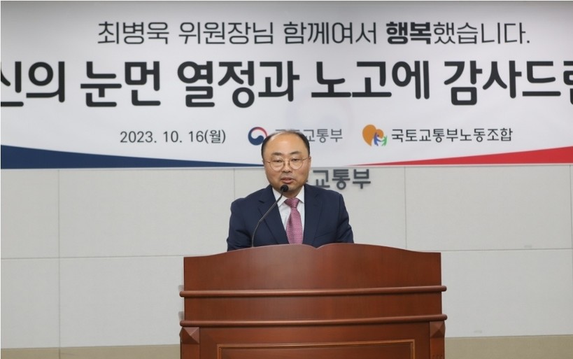▲최병욱 전 국토교통부노동조합 위원장이 16일 정부세종청사에서 명예퇴임식을 갖고 있다.(사진=국토교통부노동조합 제공) |