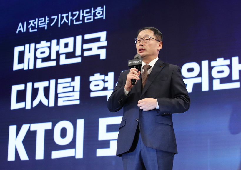 | ▲구현모 KT 대표가 지난 11월 16일 서울 송파구 소피텔 앰배서더 호텔에서 열린 KT, 인공지능(AI) 전략 기자간담회에서 AI 발전전략을 발표하고 있다.(사진=newsis) |