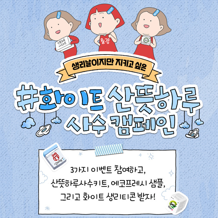 캠페인 사이트에 방문해 생리 날이지만 지키고 싶은 ‘투 두 리스트(To Do List)’를 작성하고 등록하면 추첨을 통해 화이트 에코 프레시 제품 샘플, 산뜻한 하루를 위한 제품으로 구성된 ‘산뜻 하루 사수키트’ 등이 경품으로 제공된다. 또한 ‘퀴퀴한 일기’ 이보람 작가와의 콜라보로 만든 생리 이모티콘(생리티콘)을 선착순 3만명에게 제공한다.