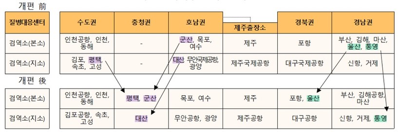 경남권 질병대응센터 소속인 국립울산검역소는 북권 질병대응센터, 호남권 질병대응센터 소속인 국립군산검역소와 수도권 질병대응센터 소속인 평택검역소(종전 평택지소)를 충청권 질병대응센터 소속으로 변경한다.