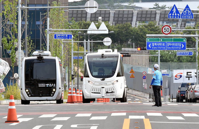 | ▲ 지난 8월 20일 대구 수성구 수성알파시티 내 순환도로에서 자율주행 셔틀버스 카모(왼쪽), 스프링카(오른쪽)가 일부구간 교통을 통제한 후 시범 운행하고 있는 모습. |