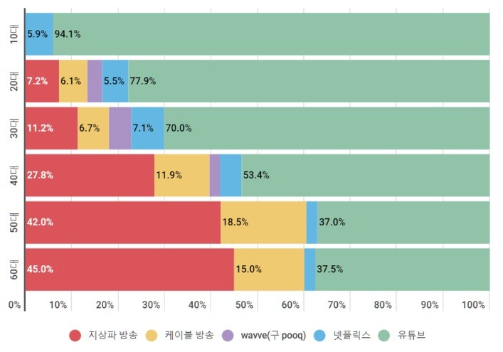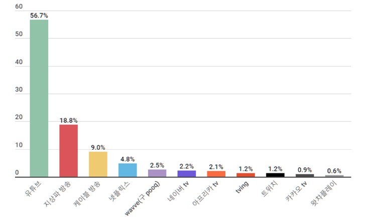 유튜브 56.7%, 지상파 18.8%, 케이블 방송 9.0%, 넷플릭스4.8%로 큰 차이 보여