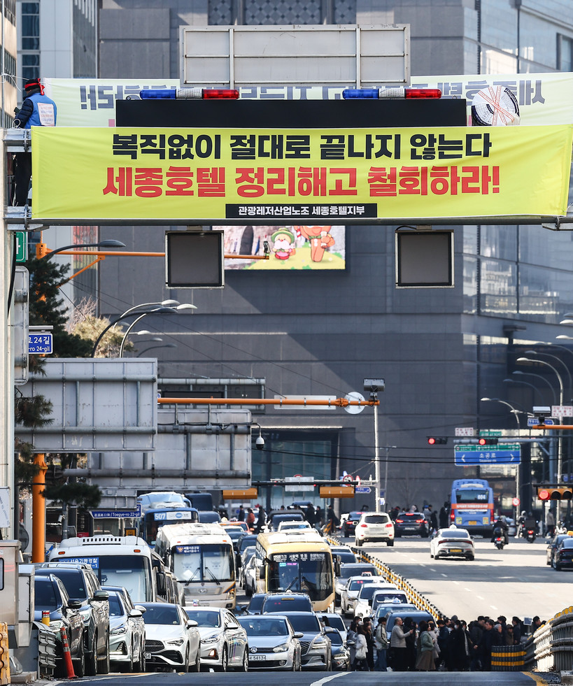 지난 4년 동안 세종호텔지부는 천막농성, 1인 시위, 오체투지 등 온갖 수단을 동원해 복직 투쟁을 이어왔다. 특히 고진수 지부장은 지난 2월 13일부터 서울 중구 호텔 앞 10m 구조물 위에서 고공농성을 시작해, 이날로 154일째를 맞았다.