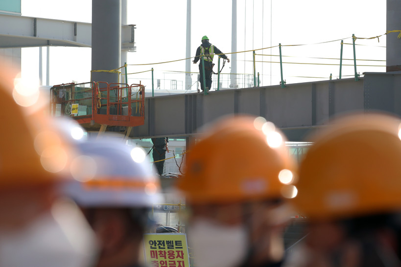 ▲ 중대재해기업처벌법 시행을 하루 앞둔 지난 26일 오후 인천국제공항 제2터미널 4단계 건설사업 현장에서 근로자들이 작업을 하고 있다. (사진=뉴시스)