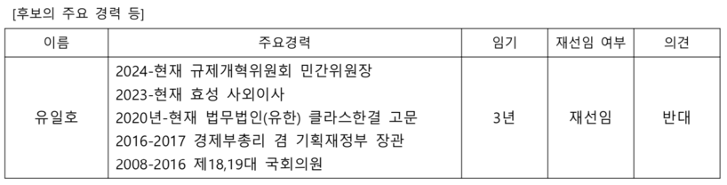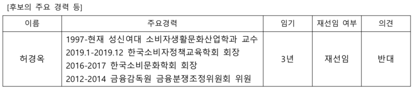 그 외에도 허경옥 후보의 경우 소비자 분야의 전문가이며 이번에 신규선임될 예정인 구윤철 후보는 기획재정부 예산실장 및 제2차관을 역임한 재정 분야의 전문가로서 각각 상법상 회계ᆞ재무전문가로 보기 어려운 것으로 판단된다고 밝혔다.