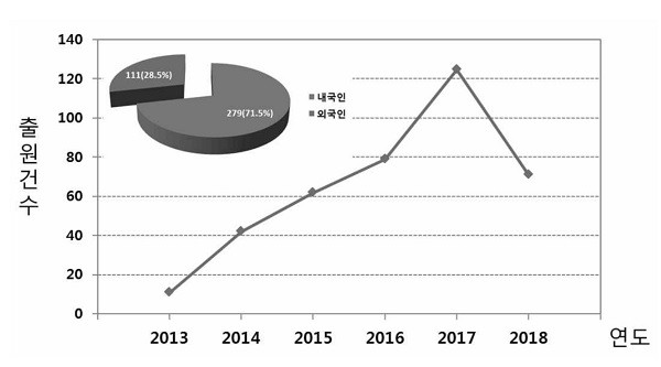 30일 특허청에 따르면 오바마 전 미국 대통령의 연두 국정연설을 계기로 3D프린팅 기술에 대한 관심이 높아지기 시작한 2013년 출원 건수가 11건에 불과했으나 2014년 42건, 2015년 62건, 2016년 79건, 2017년 125건으로 급증했다. 지난해에는 71건으로 2017년에 비해 주춤했지만 2013년 대비 약 7배 증가했다.