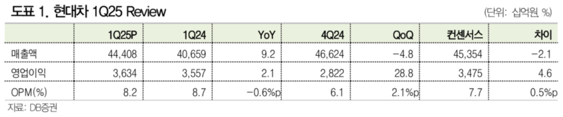 [일요주간 = 조무정 기자] DB증권 남주신 연구원은 25일 현대자동차에 대한 기업분석 보고서를 통해 “역대급 1분기 실적에도 불구하고 하반기 관세 리스크로 인해 투자심리에 변동성이 예상된다”고 평가했다.