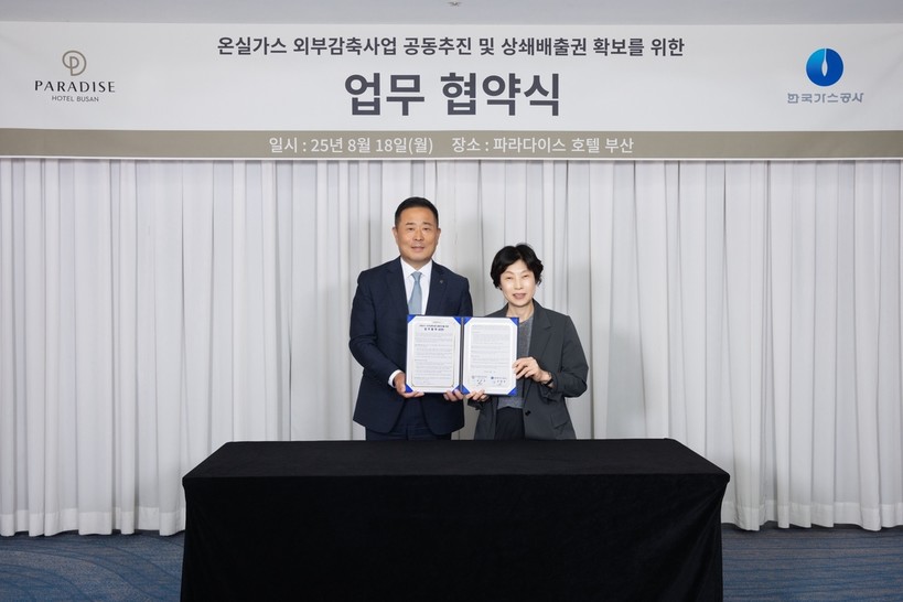 부산 해운대구 파라다이스호텔에서 열린 협약식에는 김경희 가스공사 기술기획실장과 윤진상 파라다이스호텔 부산 총지배인 등 관계자 10여 명이 참석했다. 지난해 가스공사가 에너지 효율 향상 제도(EERS) 시범 사업 일환으로 파라다이스호텔 부산의 고효율 가스보일러 교체를 지원한 가운데, 양사는 이번 협약에서 이를 환경부 상쇄등록부 시스템에 온실가스 외부감축사업으로 등록하는 데 합의했다.