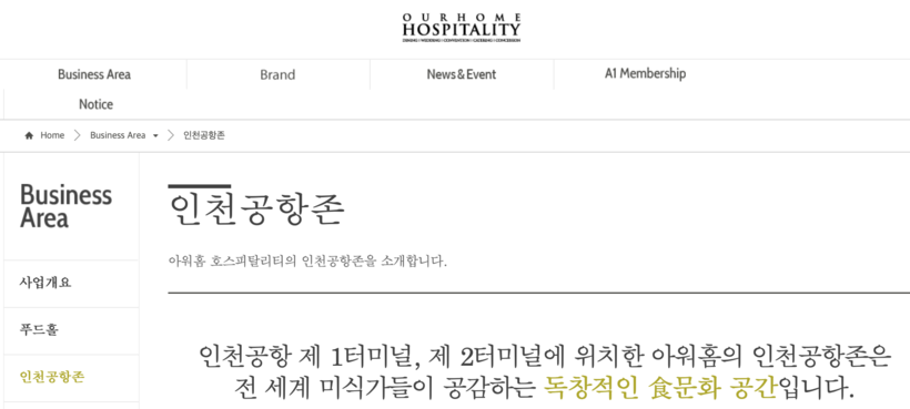 아워홈 홈페이지 상에는 외식 브랜드와 관련해 ‘인천공항존’에 입점해 있는 업체들이 상세히 소개돼 있다. 현재 아워홈과 전대체계약을 통해 인천공항에 입점해 영업 중인 외식 브랜드는 한식미담길, 별미분식, 푸디움, 푸드엠파이어 네곳으로 식품위생 교육 관리는 아워홈이 맡아서 하고 있다.