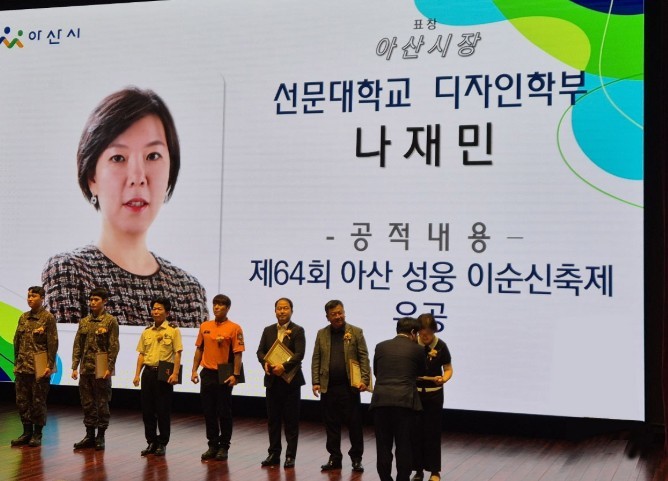 선문대학교(총장 문성제) 디자인학부 나재민 교수는 지난 6월 2일, 제64회 아산 성웅 이순신 축제에서 디자인 콘텐츠 개발에 기여한 공로로 아산시장 표창을 받았다.