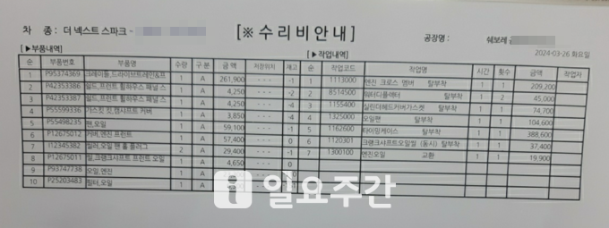 ▲차량 수리비 견적서. (사진=제보자 A 씨 제공) |