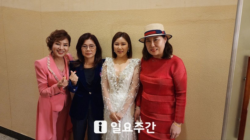 | ▲ 외쪽부터 정은 가수, 디자이너 조현숙, 송가인 , 신경미 화백 |