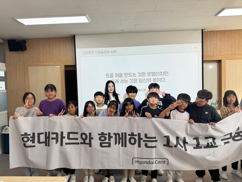 ▲ 충남 공주 우성초등학교 학생들이 현대카드의 1사1교 금융교육을 수강한 후 기념사진을 촬영하고 있다. (사진=현대카드·현대커머셜 뉴스룸 제공) |