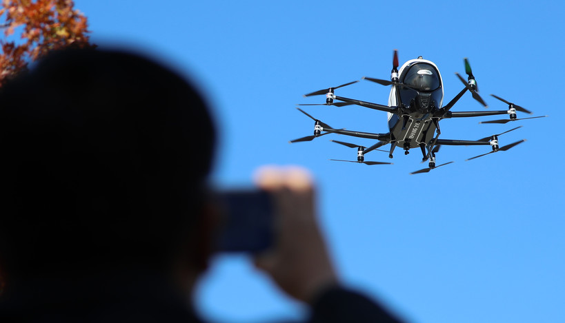 ▲도심항공교통 서울실증 행사에서 중국 이항사의 2인승급 드론택시용기체 이항216이 시범비행을 하고 있다.(사진=newsis)