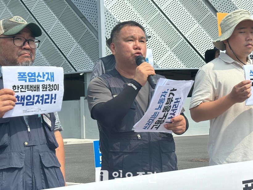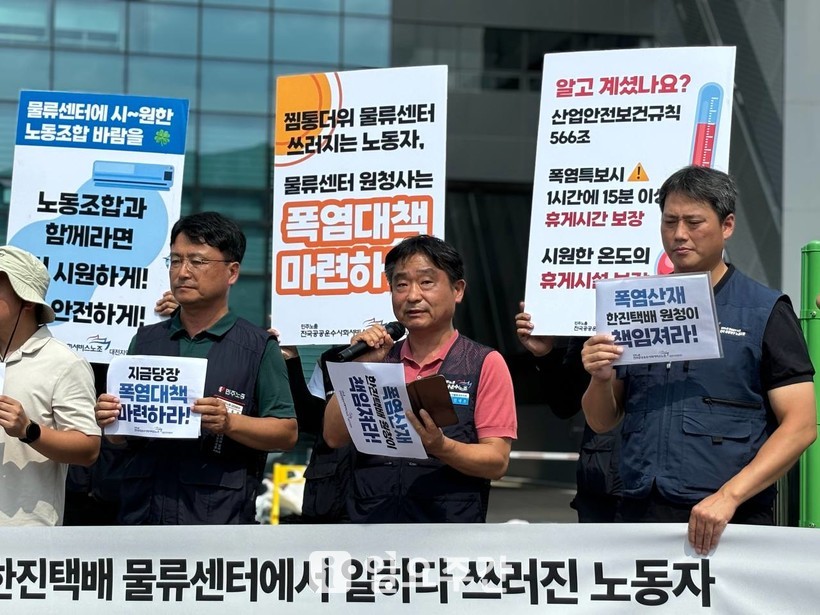 이와 관련해 지난 12일 민주노총 공공운수노조 대전지역본부(이하 공공운수노조)는 대전 유성구에 위치한 한진스마트메가허브터미널 정문 앞에서 기자회견을 열고 한진메가허브터미널 물류센터에서 벌어진 산재사고에 대한 책임을 묻고 물류센터 폭염산재에 대한 근본적 대책을 요구했다.