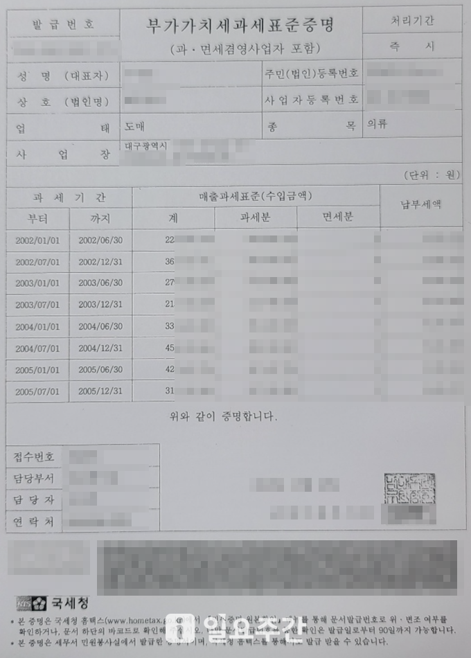 ▲ 사업자가 A대표 명의로 된 부가가치세과세표준증명원(개업일자부터 종료일까지) 내용을 검토한 바 상장회사 대표이사의 중대한 법적 문제가 포착됐다. 해당 문건은 본점과 OOO점에서 3개 브랜드 6개 매장을 운영하며 세무서에 신고한 자료이다.(자료=제보자 B씨 제공)