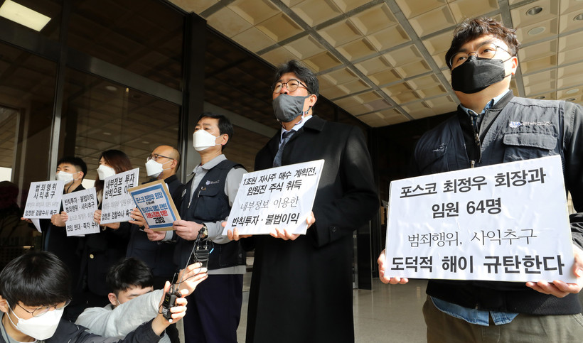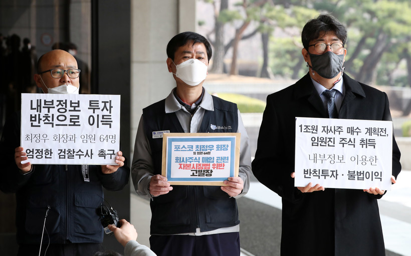 지난 9일 금속노조·민변 민생경제위원회·참여연대 경제금융센터는 최정우 회장 등 ㈜포스코 임원 64명을 '자본시장과 금융투자업에 관한 법률' 제174조 제1항(미공개중요정보 이용행위 금지) 등을 위반한 혐의로 고발하는 기자회견을 서울중앙지방검찰청 앞에서 개최했다.
