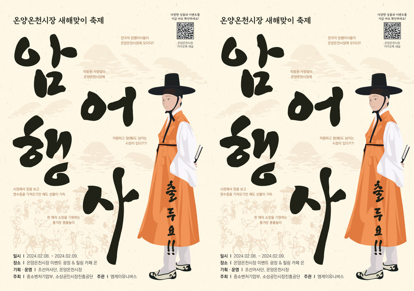 호서대 문화영상학부 조선어사단(단장 장유성 외 5명) 팀은 “많은 시민 분들이 ‘암행어사 출두요!!’ 축제를 통해 2024년 새해를 맞이하고 서로의 복을 빌어주는 마음이 따뜻한 명절을 온양온천시장과 함께했으면 좋겠다”고 밝혔다.