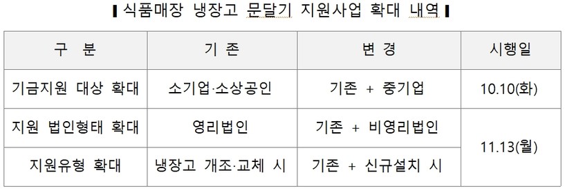 | ▲ 식품매장 냉장고 문달기 지원사업 확대 내역 (표=한전) |