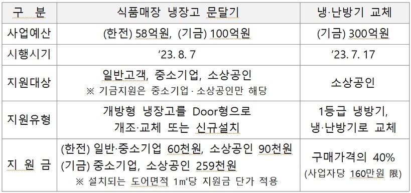 | ▲ 식품매장 냉장고 문달기 및 냉.난방기 지원사업 (표=한전) |