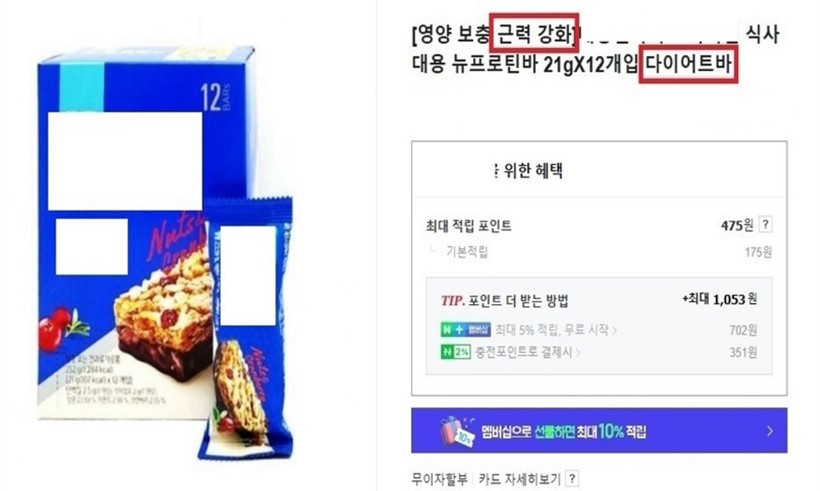 구체적으로 ▲체지방 감소 다이어트바 ▲근력 강화 다이어트바 ▲다이어트 헬스 영양간식 ▲살 안찌는 과자 ▲체중감소 지원 등과 같이 일반식품인 프로틴바를 다이어트를 위한 건강기능식품으로 소비자가 오인·혼동하도록 광고했다고 식약처는 설명했다.
