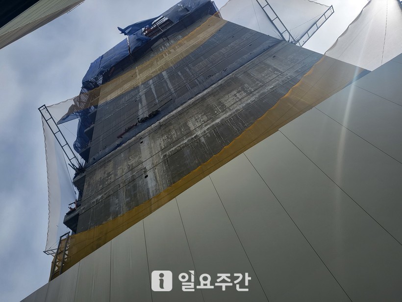<일요주간> 취재를 종합하면 아파트 건설현장 수십 미터 높이에서 떨어진 시멘트 낙하물로 인해 건설현장 옆 건물 주차장에 주차되어 있던 차량이 파손돼 시공사와 차량 소유자 간 보상협의가 진행 중이다.