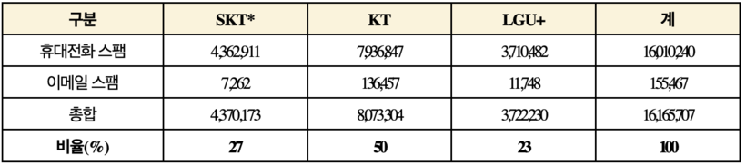 ▲ 2022년 이통3사 불법 스팸 유통현황(단위 : 건). SKT의 경우 SK브로드밴드, SK텔링크 포함.(자료=소비자주권시민회의 제공) |
