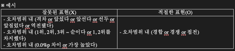 인신윤위는 오차범위 내 결과를 보도할 때에는 여론조사 신뢰구간에 따른 표본오차를 감안해 ‘1위’, ‘오차범위 내 앞서’, ‘격차’ 등의 표현 자체가 부적절하며 ‘경합’ 또는 ‘오차범위 내에 있다’ 등 순위를 매기지 않는 용어를 사용해야 한다고 강조했다.