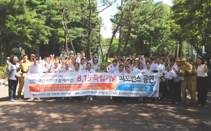 [일요주간=이수근 기자] 호서대학교(총장 이철성) 학생들이 8.15 광복절을 앞둔 지난 13일 평화의 소녀상이 있는 천안 신부공원에서 ‘8·15 독립기념 퍼포먼스’를 펼쳤다. 이번 행사는 최근 일본 정부가 자행하고 있는 ‘화이트리스트 제외 조치’ 등의 경제보복 시점에서 열려 더욱 주목을 받았다.