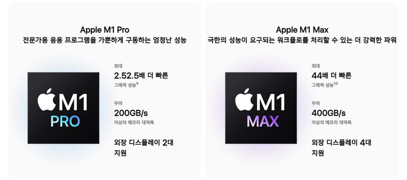 고성능 칩인 M1 맥스는 570억개의 트랜지스터를 사용해 만든 가장 넓은 아키텍처의 칩이다. 그래픽 처리장치(GPU)도 M1프로는 전작 대비 최대 2 배, M1맥스는 최대 4 배 빨라져, 고성능의 그래픽 작업도 순식간에 처리할 수 있게 됐다.