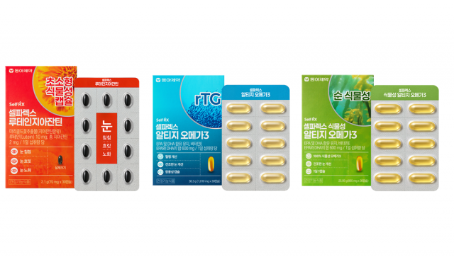 ▲ 동아제약이 출시한 단일 성분 건강기능식품 셀파렉스 베이직 라인 3종. 셀파렉스 루테인지아잔틴, 셀파렉스 알티지 오메가3, 셀파렉스 식물성 알티지 오메가3. (사진=동아제약 제공) |