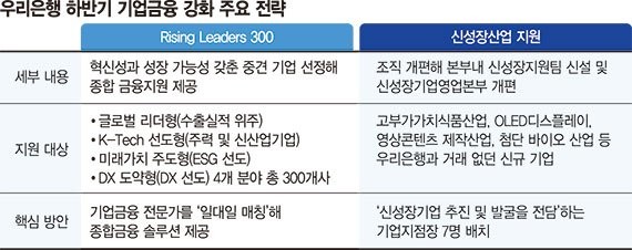 우리은행은 또한 기존과는 다른 신규 기업들과의 협업을 위해 본부 조직을 개편하였다. 지난 달, 본부 내에 신성장지원팀을 신설하고, 기업 영업 본부를 확대하여 총 7명의 새로운 지점장을 배치하였다. 이들은 OLED 디스플레이, 첨단 바이오 등 우리은행과 이전에 거래하지 않았던 새로운 기업들을 중심으로 활동하게 될 것으로 보인다.