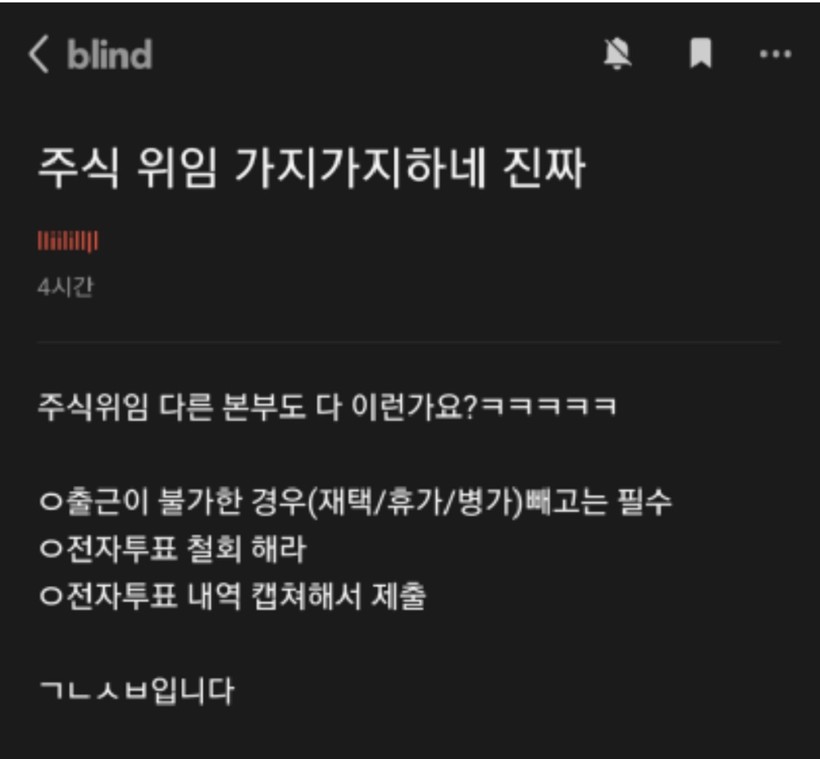 KT새노조는 “KT가 이번처럼 조직적으로 위임을 강요하고 있는 것은 전례 없는 이상 행동”이라며 “이는 경영진이 준비한 안건 처리에 대한 반발이 높다는 것”이라고 강조했다.