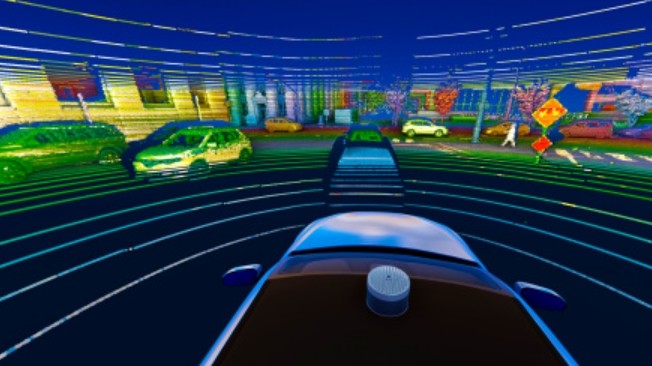 | ▲ 벨로다인 알파 퍽이 생성한 포인트 클라우드는 차량 주변의 사람과 물체의 위치를 동시에 찾고 움직이는 속도와 경로를 평가할 수 있다.(벨로다인 라이더 제공) |