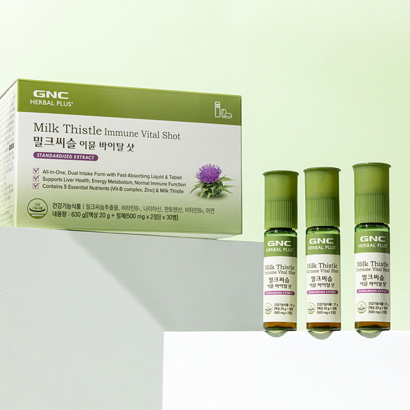 ‘GNC 밀크씨슬 이뮨 바이탈 샷’은 밀크씨슬추출물의 기능성 성분인 실리마린의 1일 최대 권장량인 130mg을 함유하고 있어 간 건강에 도움을 줄 수 있는 제품이다. 뿐만 아니라 비타민B군, 아연 등 필수 영양성분 5종도 함유해 정상적인 면역 기능 유지와 에너지 생성에 도움을 줄 수 있다.