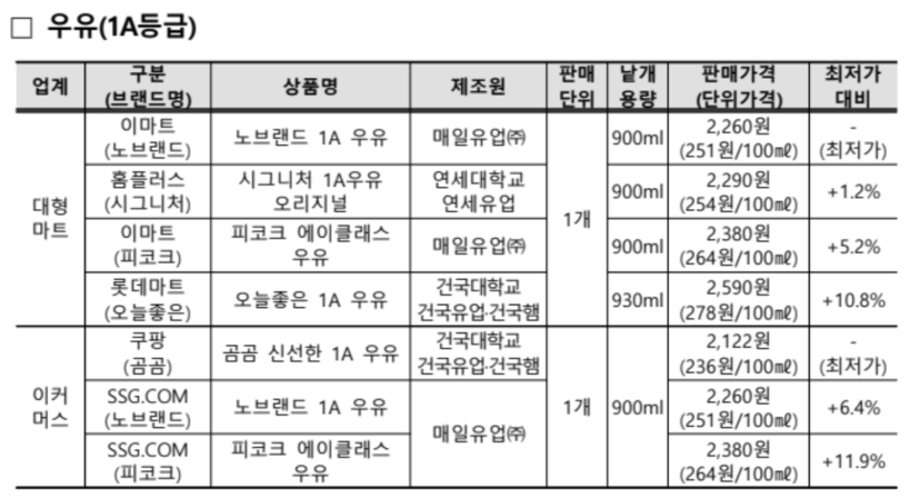 이커머스의 PB 우유(1A등급)는 쿠팡이 2122원(900㎖, 1개, 236원/100㎖)으로 가장 저렴했으며 SSG닷컴은 2380원(900㎖, 1개, 264원/100㎖)으로 쿠팡 대비 단위가격이 28원(11.9%) 비쌌다.
