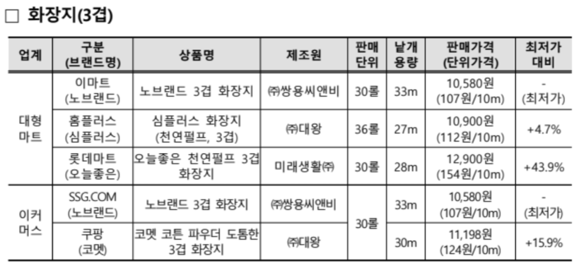 조사 결과 대형마트에서 판매하는 PB 화장지(3겹)는 이마트가 1만 580원(33m, 30 롤, 107원/10m)으로 가장 저렴했다. 롯데마트는 1만 2900원(28m, 30 롤, 154원/10m)으로 이마트 대비 단위가격이 47원(43.9%) 비쌌다.