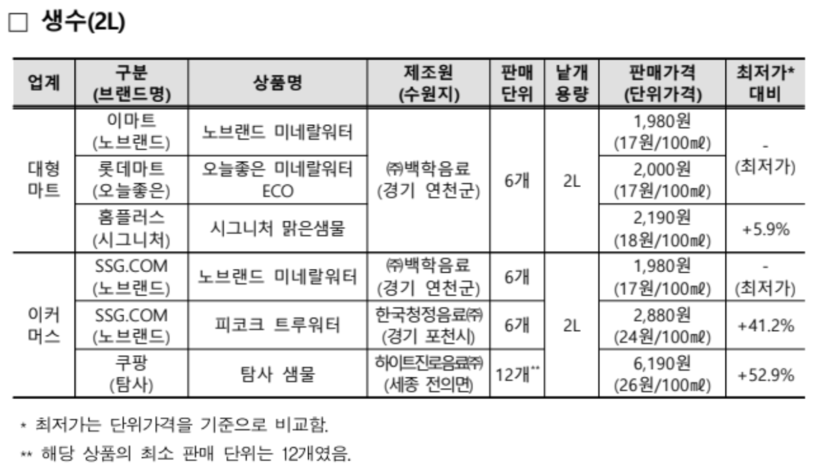 이커머스의 PB 생수(2L)는 SSG닷컴이 1980원(6개, 17원/100㎖)으로 대형마트와 단위가격에 차이가 없었으나 쿠팡은 6190원(최소 판매 단위가 12개, 26원/100㎖)으로 SSG닷컴보다 단위가격이 9원(52.9%) 비쌌다.